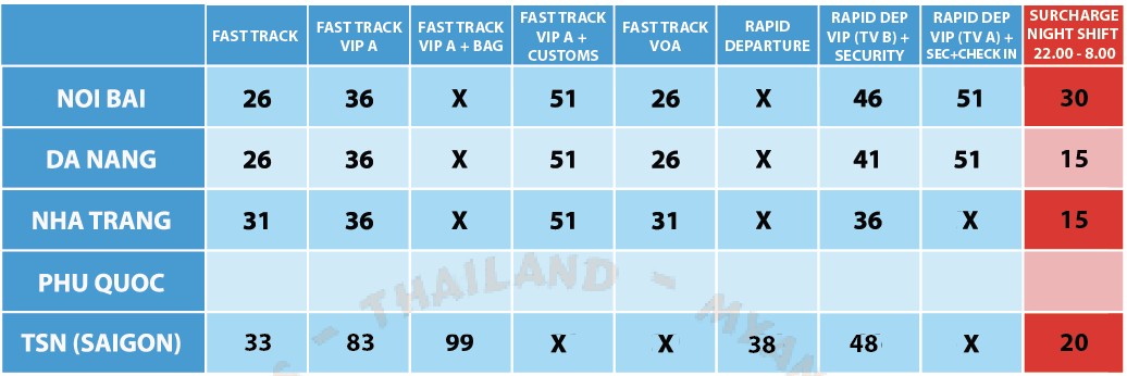 Fast Departure VIP A: Pomoc przy check-in, zaleznie od linii szybsza lub priorytetowa odprawa / spotkanie przy bramkach automatycznych po uzyskaniu boarding pass. Fast Track: Linia dyplomatyczna / APEC / linia skrócona, Priorytetowa kontrola bezpieczeństwa